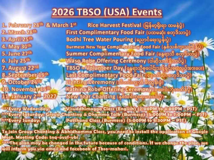 TBSO invites you to the group chanting and meditation for Burmese which will be held at DhamaGoneYee Mahasi Monastery in Snohomish. details